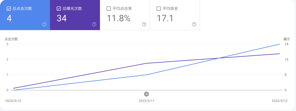 - 展示次数:用户在 Google 上看到指向您网站的链接的次数。根据搜索结果类型,可能需要将链接滚动或展开到用户视野范围内,才会计为一次展示。